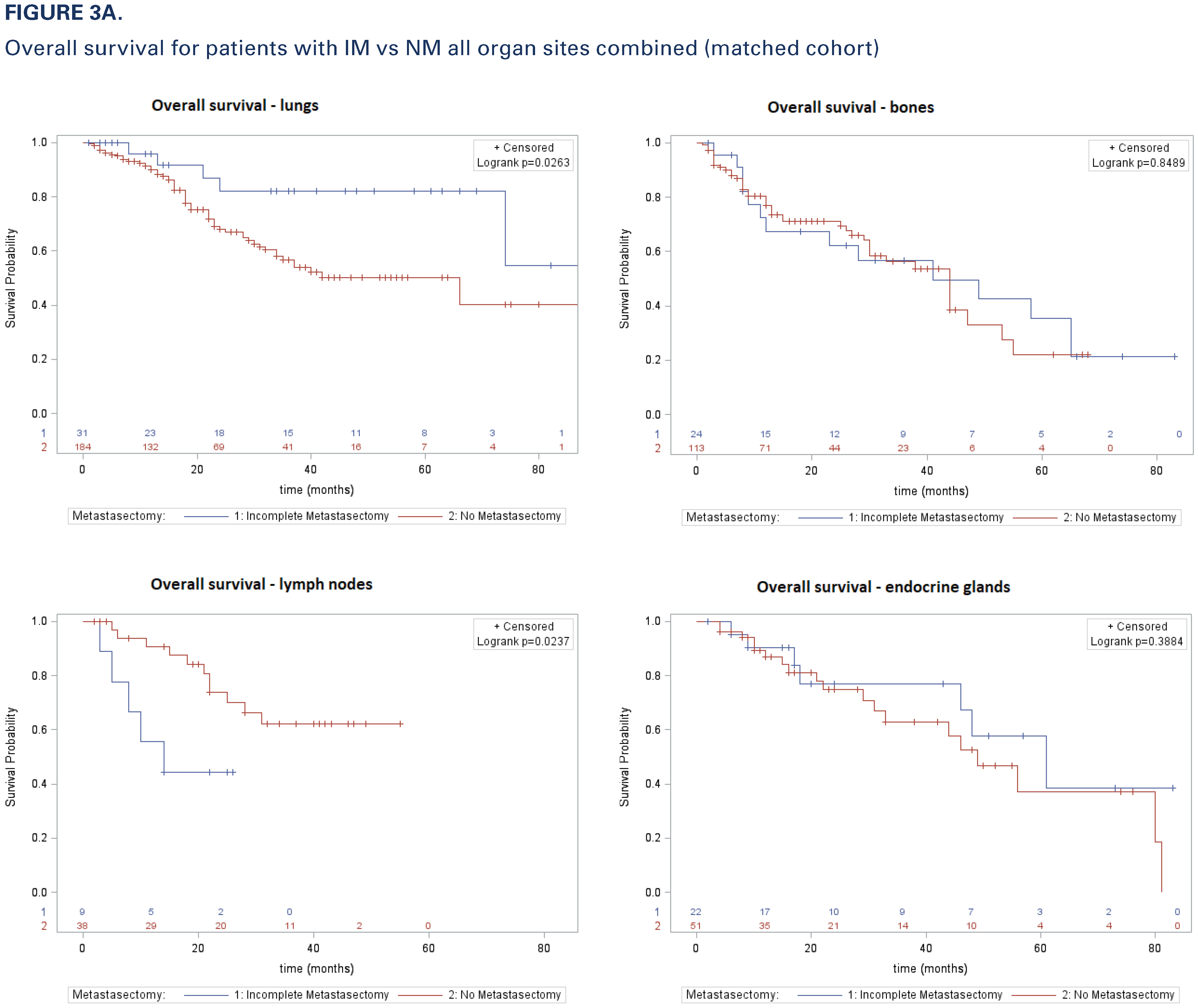 P = 0.024). Yet this finding should be interpreted with caution, as this analysis is likely underpowered to assess the role of IM on lymph node metastasis since only 9 patients received an incomplete resection of lymph nodes, and no multivariate analysis was possible. Additionally, lymphadenectomy is often done in conjunction with organ metastasectomy. Our study confirmed that there is no benefit for OS when single or multiple metastatic sites are incompletely resected. Therefore, the role of lymphadenectomy is limited and should not be part of a multi-site IM. Analysis of liver and brain IM was inadequate because of the small number of cases present in our registry (8.7% and 5.1%, respectively). As for endocrine IM, our results confirmed the absence of survival benefits (