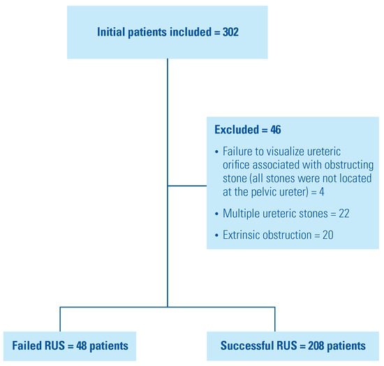 The study included 256 patients who presented with acute complicated calculus obstructive uropathy and were managed initially by RUS trial (Figure 2). Four patients were excluded because of failure to visualize ipsilateral ureteric orifice associated with obstructing stones located in sites in the ureter other than the pelvic ureter (2 in the lumbar ureter and others in the iliac ureter away from intramural ureter). Forty-eight patients (18.8 %) had RUS failure and then were managed by PCN insertion. The patient characteristics were illustrated in Table 1.