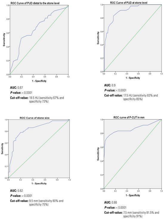 In univariate analysis, acute pyelonephritis, higher maximum transverse stone diameter, the higher degree of hydronephrosis, increased P-CUT, and increased PUD below and at the stone level were predictors for initial RUS failure (Table 1). ROC curve was then calculated to identify the cut-off values associated with the best greatest sensitivity and specificity for significant continuous variables in univariate analysis (Figure 3).