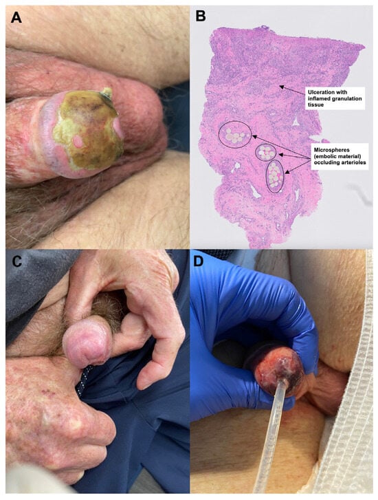 Penile tip necrosis encountered following prostatic artery embolization: (A) A 63-year-old male (case 1) who developed penile tip necrosis 1 week following PAE; (B) Areas of necrosis over the glans were biopsied which revealed embolization of the Embozene Microspheres (circled) from the prostatic artery embolization within the vessels of the specimen, with surrounding inflammation and ulceration; (C) Three months following PAE, the areas of necrosis had completely healed; (D) An 84-year-old male (case 2) who developed penile tip necrosis day 7 post- procedure.