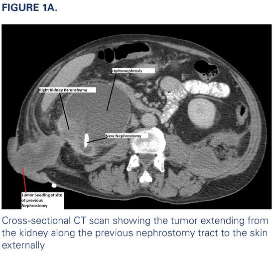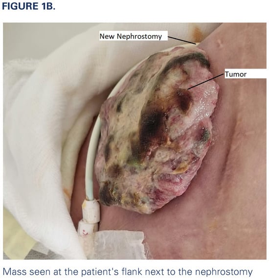 A 57-year-old man, with a history of nephrolithiasis and heavy smoking (80 pack years at presentation), presented to a tertiary cancer center 2 years ago with urothelial carcinoma (UC) in the right distal ureter associated with lung metastasis. On initial presentation, the patient complained of right flank pain, gross hematuria, and weight loss. Imaging revealed a 3.7 cm right distal ureter mass with severe right hydronephrosis (Figure 1a) and a 3.2 cm lung lesion, which was proven by biopsy to be metastatic UC. A right nephrostomy was inserted for palliation of symptoms and to manage recurrent obstructive pyelonephritis. The patient’s disease progressed despite multiple lines of chemotherapy and immunotherapy. He developed infection at the nephrostomy site with associated emphysematous pyelonephritis. This was managed with antibiotics and placement of a new nephrostomy at a different site, and palliative nephrectomy was considered. After resolution of the infection, the patient was noted to have a small malodorous mass at the site of the previous nephrostomy that progressively grew in size over 4 months (Figure 1b). Biopsy of the mass revealed UC.