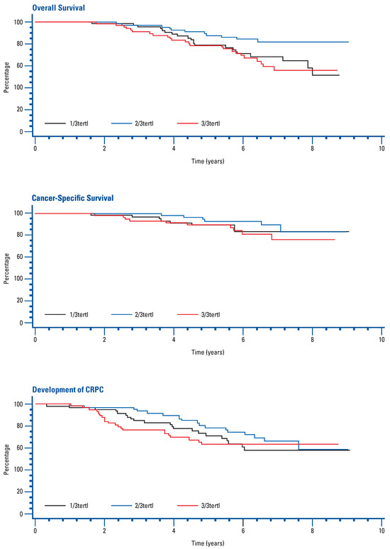 Univariate and multivariate Cox regression analysis adjusted for age, Gleason score, baseline PSA, time since radiotherapy, and ECOG status found no significant association between FSH tertile and OS, CSS, or time to development of CRPC (Figure 1, Table 2).