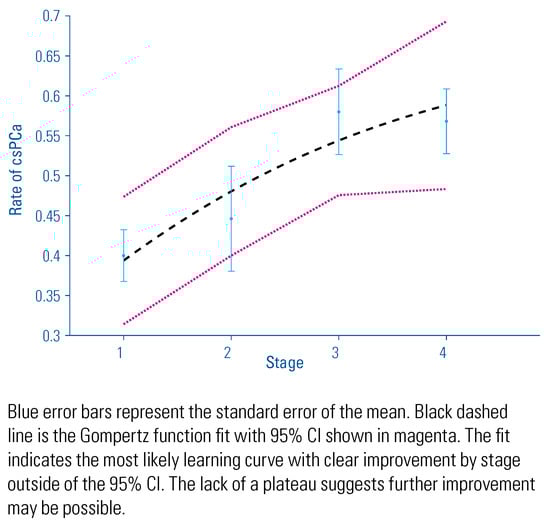 The Mann-Whitney U-test was used to compare non-parametric values, with a threshold of P < 0.05 considered significant. A Gompertz function [16] was used to model learning curve through non-linear curve fitting. A multivariate logistic regression model was used to compare the detection rates at each stage with clinical risk factors such as age, PSA, DRE status, and family history. Clinical risk factors were combined using the validated PBCG nomogram [15] into a single value to prevent overfitting on this limited dataset. Only practitioners who had successfully completed stages 1 to 3 of the program were included in this analysis to avoid bias from having different individuals at stage 1 compared with the later stages. All computational modeling was performed in MATLAB (Mathworks, Natick, United States).