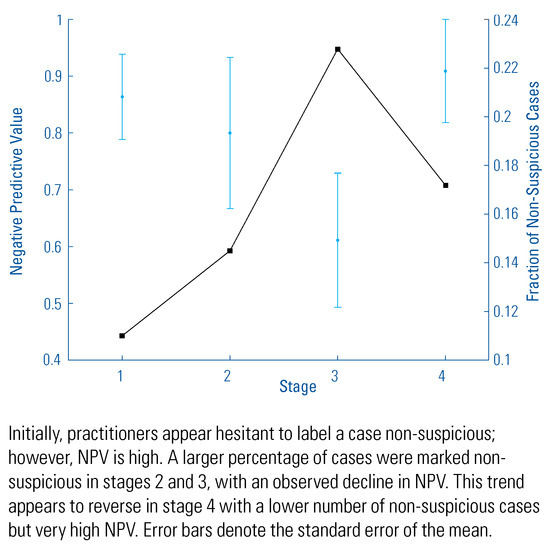 Ability to correctly identify negative cases also varied with stage of training, although the relationship appears more complex. Figure 2 shows an initial negative predictive value (NPV) of 86% in stage 1 with 11% of cases marked as non-suspicious or negative. The number of cases marked as non-suspicious increased through stages 2 and 3 while NPV declined. This trend reversed in stage 4 in which the fraction of cases marked non-suspicious decreased somewhat to 17% while NPV rose to 91%. Despite these changes in false negative rate, specificity showed a simple improvement over the course of the program increasing from 16% to 37% (P = 0.01).