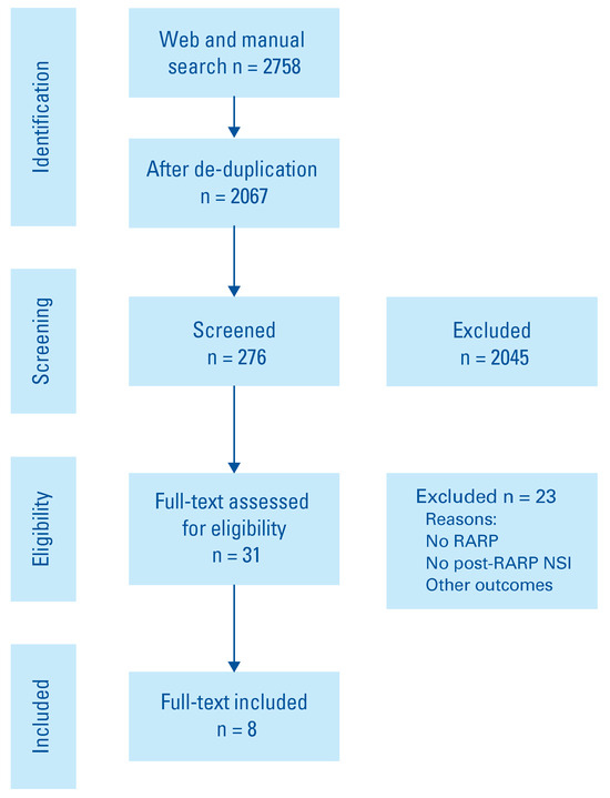 The Population, Intervention, Comparator and Outcome (PICO) criteria were used to frame the aims of the current systematic review. The population of inter- est consisted of patients who had undergone RARP for PCa (P). Postoperative NSI for the management of post-RARP UI were the evaluated interventions (I). A no-NSI comparator was considered mandatory for the specific purpose of the current review (C). The primary aim was to evaluate the impact of NSI strategies in UC recovery after RARP in terms of UC rate and/or time to achieve UC. Secondary aims were to identify patient compli- ance with these treatments, risk factors associated with UI, and correlation between UC restoration and sexual activity recovery (O).