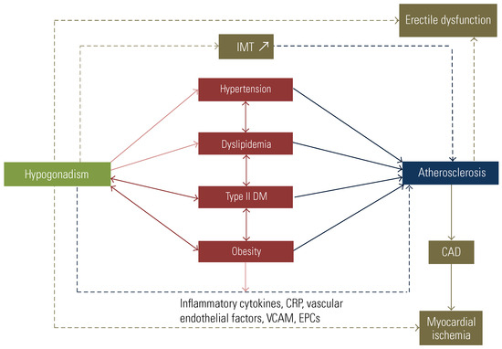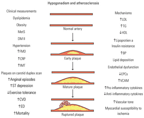 - Fahed, A.C.; Gholmieh, J.M.; Azar, S.T. Connecting the lines between hypogonadism and atherosclerosis. Int. J. Endocrinol. 2012, 2012, 793953. [Google Scholar] [CrossRef] [PubMed]