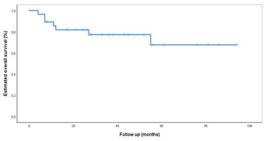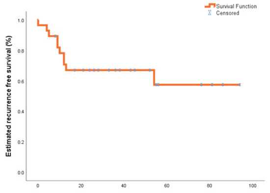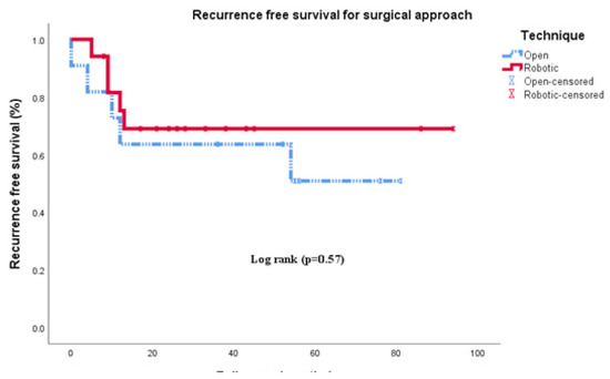 Mean follow-up was 37.8 ± 25.3 months. The esti- mated mean recurrence-free survival for this cohort was 61.8% (CI 46.0 to 77.6) (Figure 1). Recurrences and their management are listed in Table 4. Radical surgery did not seem to add therapeutic benefit in recurrent locally advanced disease. The estimated mean overall survival was 71.6 % (CI 57.4 to 85.8) (Figure 2). Ten patients (37%) died of cancer. By Kaplan-Meier estimate there was no significant difference in recurrence-free survival in patients who underwent open surgery versus those who had robot-assisted surgery (log-rank P = 0.57) (Figure 3).