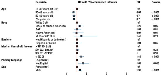 On multivariate logistic regression, age over 30 decreased the odds of being seen in person (OR 0.67 to 0.70, P < 0.01). Lowest income quartile (OR 1.46, P < 0.001), primary language other than English (OR 1.61, P = 0.003), and male sex (OR 1.32, P < 0.001) increased the odds of being seen in person (Figure 1).