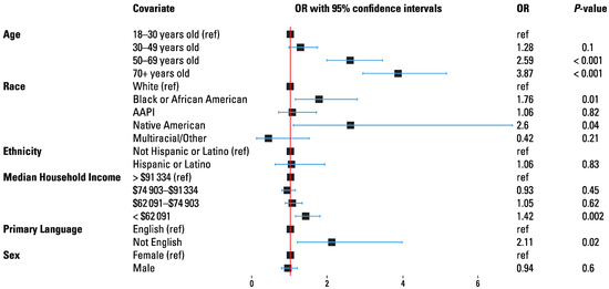 On multivariate logistic regression, age > 50 (age 50 to 69 OR 2.59, P < 0.001 and age > 70 OR 3.9, P < 0.001), being Black (OR 1.8, P = 0.014) or Native American/Alaskan Native (OR 2.6, P = 0.04), income < $62 091 (OR 1.42, P = 0.002), and primary language other than English (OR 2.1, P = 0.016) increased the odds of having a telephone rather than a TSC visit (Figure 2). Sex did not demonstrate a significant effect.