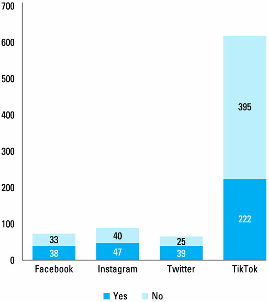 The differences in the results can be explained by the different algorithms of the platforms, as Instagram, Twitter, and Facebook have home pages that primarily show users posts from accounts that they have already followed. TikTok, however, uniquely directs users to the “For You” page that includes content from accounts that users may or may not follow but that are algorithmically tailored to their interests, according to their likes, comments, and searches. While most social media platforms do use machine learning to tailor content to users based on previously demonstrated interests, TikTok does so on its main user interface and to a greater extent.