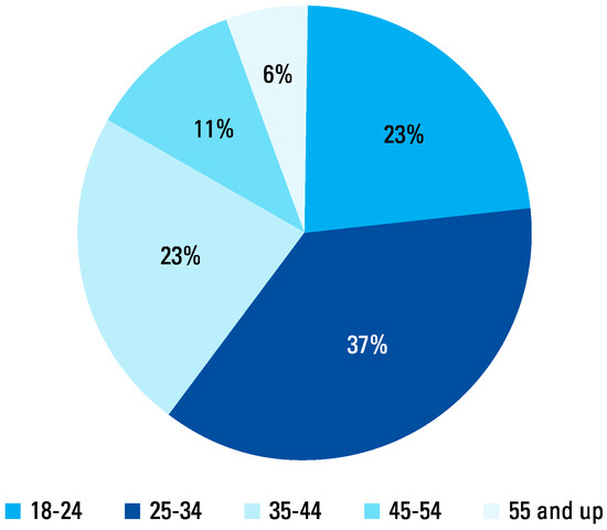 Demographic and geographic data collected on TikTok showed that the majority of poll viewers, regardless of engagement or response, were 25 to 35 years old (Figure 3), equally likely to be male (50%) or female (50%), and from the United States (63%).