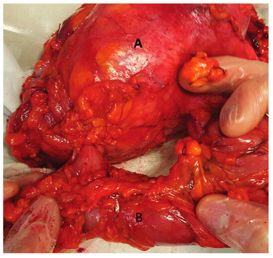 One-piece resection: native left kidney (A) with fistula tract facing the left colon (B).