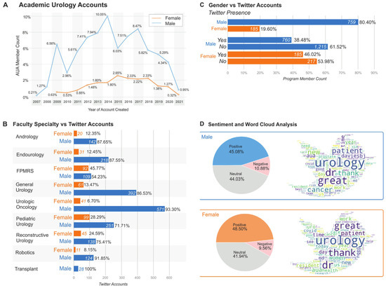 General Twitter presence and number of user accounts from 2007 to 2021. Academic Urology Twitter presence is shown by number of Twitter accounts by year (A) stratified by male vs female. In addition, total Twitter academic urology presence is broken down by specialty and gender (B). Overall academic Twitter presence based on gender can be seen in C, showing overall percentage of Twitter accounts (top) and broken down by proportion of all academic urologist (bottom). (D). Sentiment analysis designated as neutral, negative or positive from each users’ tweets, with bird gram representative of most commonly utilized words within the tweets corresponding to the size of the word.