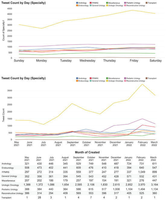 When assessing temporal trends across specialties by month and day, urologic oncology represented the highest tweet count overall, with peaks in September 2021 (529), January 2022 (724), and February 2022 (731). January and February corresponded to similar trends among other specialties likely reflecting AUA match, while many specialty meetings corresponded to peaks in activity. Overall, Monday represented the lowest activity day on average, with Twitter activity increasing from Thursday and peaking on Friday night (Figure 3).