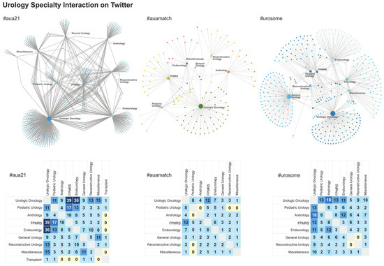 Interaction analysis based on subspecialty direct interaction with others on three different topics including #aua21, #auamatch, and #urosome. Interaction tables represent the number of direct conversations between members of each subspecialty focused on the topic at hand.