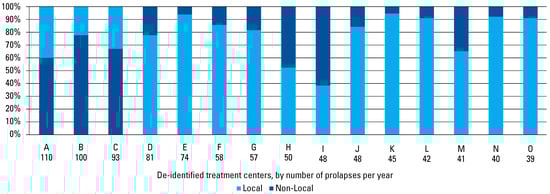 Proportion of patients receiving care locally (within 20 miles) at top 15 Washington State facilities from 2008 to 2019by average annual volume of vaginal prolapse, rectal prolapse, or concurrent vaginal and rectal prolapse surgeries.Centers sorted in descending order of average number of prolapse procedures per year for each center.