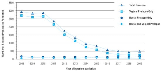 Female inpatlent prolapse procedures by prolapse type for Washington State from 2008 to 2019.Total prolapse iscombined total of vaginal,rectal, and concurrent vaginal and rectal prolapse surgeries.
