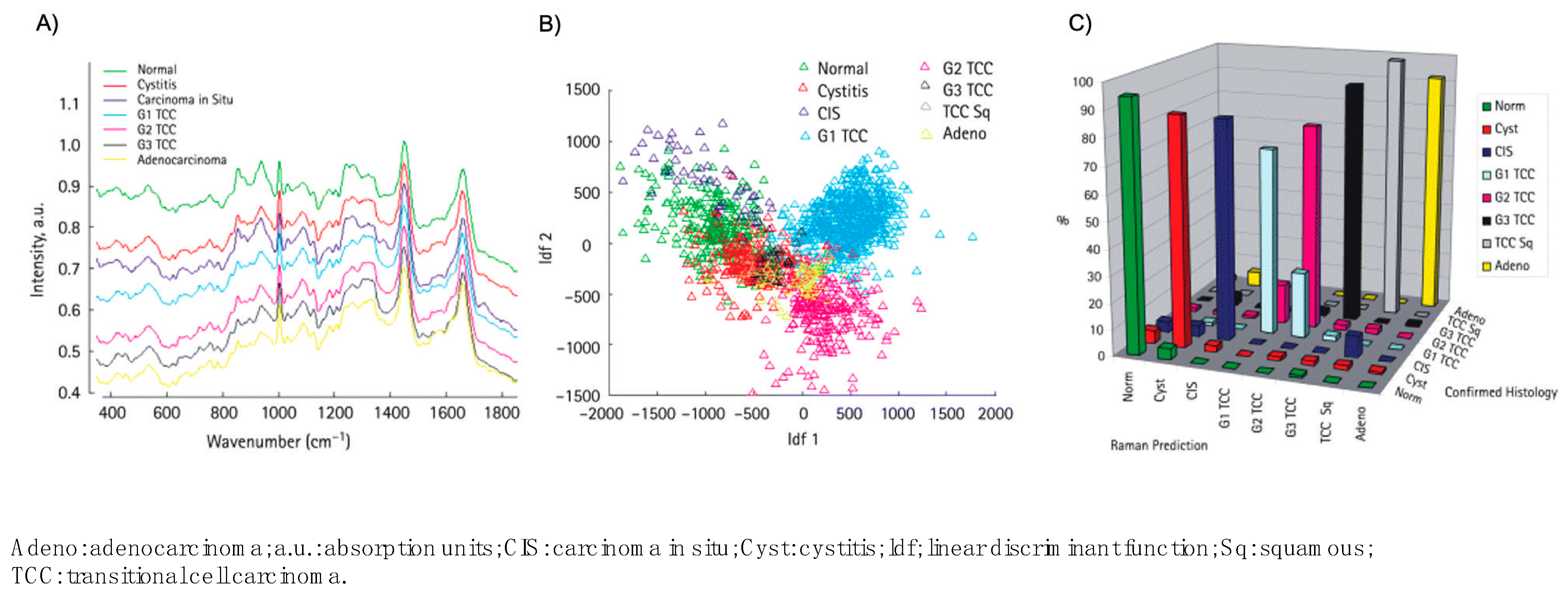 - Jin, D.; Wang, X.; Fu, B.; Li, T.; Chen, N.; Chen, Z.; et al. Raman spectroscopy of luminal subtype and basal subtype muscle invasive bladder cancer. Int J Clin Exp Med. 2019, 12, 5447–5453. [Google Scholar]