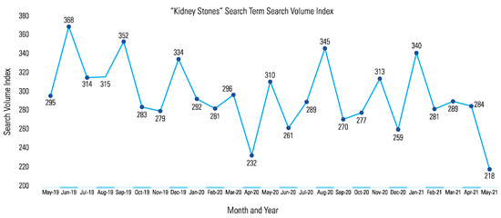 Google Trends Search Volume Index score for the ‘kidney stones’ search term from May 2019 to May 2021.