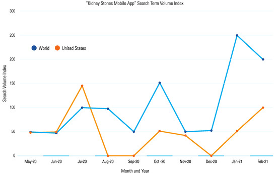 Google Trends Search Volume Index score for the ‘kidney stones mobile app’ search term in the US and worldwide from May 2020 to February 2021.
