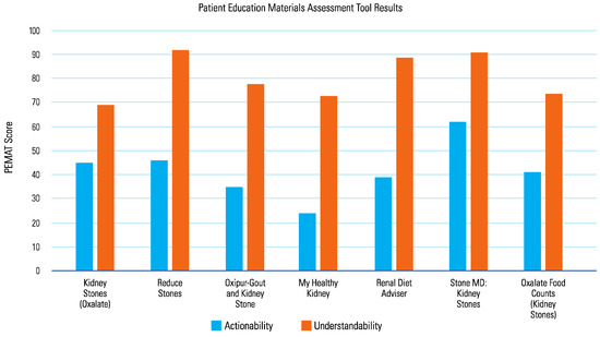 The PEMAT tool, a 26-question assessment, was used to assess the understandability and actionability of information provided in the 7 kidney stone smartphone apps based on urological kidney stone management guidelines and recommendations [15,16,17,18]. A score of 70% among the individual apps was used as a cutoff to differentiate poor versus good understandability and actionability. This threshold was chosen on the basis of previously published work, and apps were evaluated by the same 3 authors [19,20].