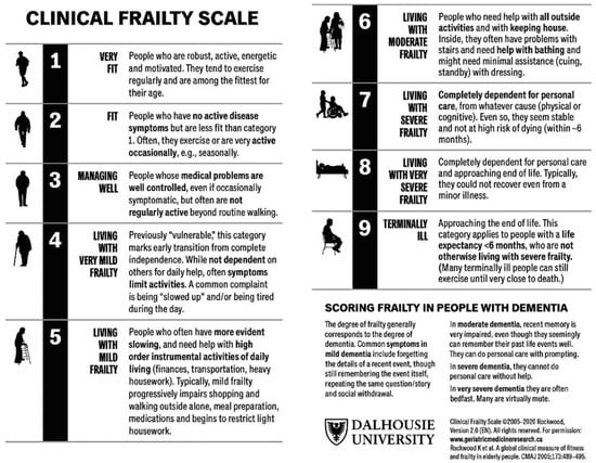 Clinical Frailty Scale, The Clinical Frailty Scale Version 2.0 by Rockwood K, et al. To apply the Clinical Frailty Scale, the assessor judges the degree of a patient’s frailty based on information gathered from a formal clinical assessment after considering their cognition, mobility, comorbidities, and functional capabilities to assign a frailty score from 1 (very fit) to 9 (terminally ill) [].