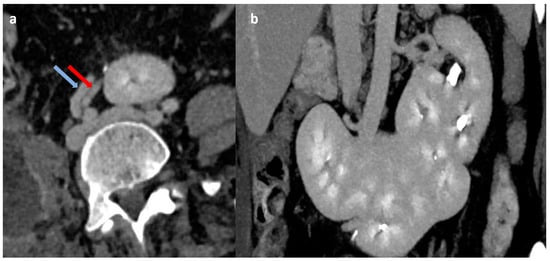 Contrast-enhanced CT abdomen images (a) in axial plane showing the vascular supply of transversely oriented supernumerary kidney unit from right common iliac artery (red arrow) and vein (blue arrow); (b) in coronal plane showing triple fused supernumerary kidneys.