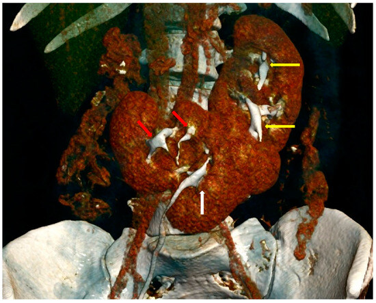Computed tomography urography three-dimensional-reconstructed image showing all three fused kidneys with both the longitudinal axis kidneys having duplex collecting system (red and yellow arrows) and the transversely oriented kidney having its separate collecting system (white arrow).