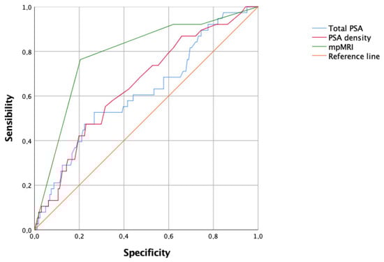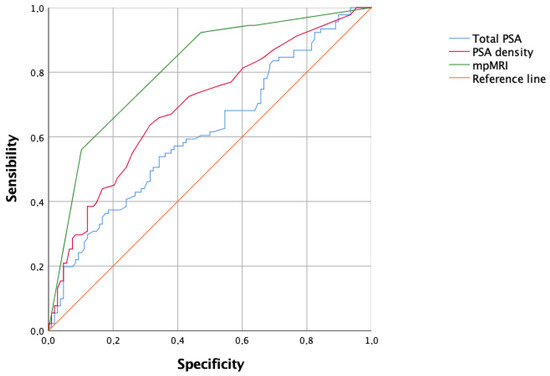 Accuracy of PSA, PSA density and mpMRI to predict aggressive prostate cancer (overall cohort). mpMRI = multiparametric MRI.