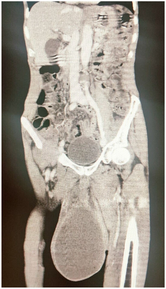 An abdominopelvic CT scan and a scrotal ultrasound showed a bilateral septate hydrocele, measuring 41 × 23 × 15 cm on the right and 8 × 7 × 4 cm on the left (Figure 2).