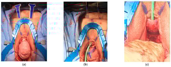 In the treatment of females with both POP and SUI, options include conservative treatments like lifestyle changes, such as weight loss; routine pelvic floor exercises (Kegel exercises); and obstetric care strategies, such as reducing pushing time during labor [19]. Surgical approaches may include procedures such as the placement of a mid-urethral sling (retropubic or transobturator) (Figure 6a–c), autologous fascia pubovaginal sling placement, or Burch colposuspension based on the AUA SUI guidelines from 2023 [6]. Before considering surgical intervention for patients with concurrent stress urinary incontinence and pelvic organ prolapse, thorough history-taking, a detailed physical and pelvic examination, a limited neurologic examination, a post-void residual volume assessment, and a urinalysis should be performed. Based on the 2023 AUA SUI guidelines [6], additional evaluation is warranted for patients with high-grade pelvic organ prolapse (POP-Q stage 3 or higher) if SUI is not observed upon prolapse reduction.
