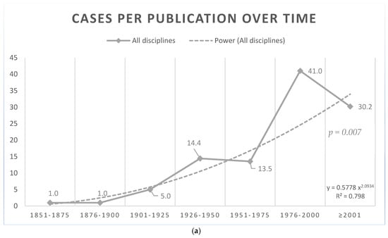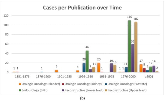 Historical analysis of pioneering techniques in urology. (a) Cases per publication total over all sub-specialties over time. Linear regression, R2 = 0.798, OR = 6.29 [95% CI: 2.57 to 10.02], p = 0.007. (b) Cases per publication per discipline (separate bar) over time.