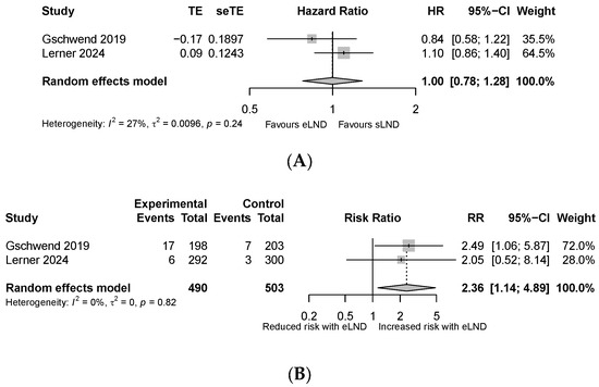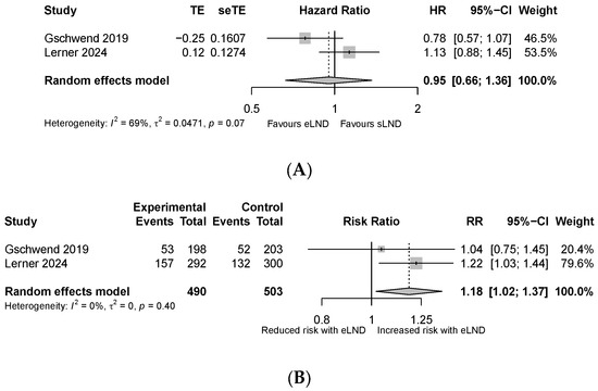 Forest plot of secondary outcomes: (A) disease-free survival and (B) lymphoceles requiring intervention. The gray diamond represents the summary effect and the dotted line is the point pooled effect [10,11]. eLND—extended lymph node dissection, sLND—standard lymph node dissection.
