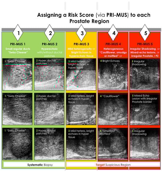 Conventional transrectal ultrasound (TRUS) of the prostate typically employs a 6–9 MHz curved linear endocavity transducer, which provides real-time imaging crucial for procedures such as local nerve blocks and systematic biopsy guidance []. However, while it can detect internal prostatic tissue, its sensitivity for targeted sampling is limited, with an axial resolution of 210 μm insufficient to visualize the prostatic ductal architecture. To address this limitation, a new MicroUS system was developed, offering a resolution of 70 μm—optimal for visualizing the prostate ducts, which average 100 μm in size. This system allows imaging of the entire prostate while maintaining high sensitivity and specificity. Clinical testing in patients undergoing radical prostatectomy demonstrated superior accuracy compared to conventional TRUS, with further validation by Pensa et al., showing that MicroUS resolves approximately 95% of prostatic ducts compared to 15% with conventional ultrasound. The success of MicroUS is attributed to advanced transducer designs featuring densely packed elements with wide bandwidth, enabling improved penetration depth and a full field of view while maintaining high resolution. Unlike traditional ultrasound, MicroUS effectively visualizes tissue architecture across all prostate zones, including the anterior, transition, and peripheral zones. New clinical interpretation protocols, such as the PRI-MUS (Prostate Risk Identification using Micro-UltraSound) system, first described by Ghai et al., have been developed to identify cancer-specific patterns on MicroUS, demonstrating robust cancer detection across all prostate regions (Figure 2). This technology represents a significant advancement in prostate imaging and cancer detection [,,,,].