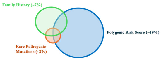 The PRS is a direct measurement of the genetic risk based on germline DNA, and is independent of environmental risk factors. Furthermore, due to a combination of hundreds to thousands of SNPs, the PRS is a personalized measurement of an individual’s genetic risk. Each person, even within the same family, may have a unique PRS value. This is different from FH, where all first-degree relatives are assigned the same genetic risk, even though they only share 50% of genetic material between them. Notably, the PRS provides additional information beyond FH and the currently known RPMs for stratifying prostate cancer risk. While FH and RPMs can identify ~7% and 2% of men at high risk for prostate cancer, respectively, the PRS can identify ~19% of men at a risk similar to the relative risk of FH and RPMs (Figure 1 and Figure 2) [13,14]. In addition, unlike FH and RPMs, where unaffected individuals are less informative and generally considered as having an average risk, PRS values can identify ~20% of men whose risk is half that of the general population. The ability to identify low-risk individuals who may benefit from delayed or less intense screening programs is unique to PRS values. Finally, PRS values have been inversely associated with the age of diagnosis, and therefore, men with higher PRS values may potentially benefit from more intensive and earlier screening [15].