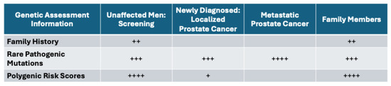 Relative importance of genetic information informing various stages of prostate cancer, number of + signs indicate relative importance.