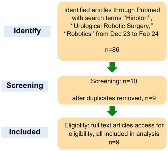 A systematic search was carried out across Pubmed from December 2023 to February 2024, with the search terms ‘‘Hinotori’’, ‘‘Urological Robotic Surgery,’’ ‘‘Robotics’’ and other terms deemed relevant to the scope of the study. An initial number of 10 articles were included in the initial search. Duplicates were excluded and articles were screened. Studies that focused on other novel robotic platforms were excluded. After exclusion, a total of nine studies were finalised for review (Figure 1). Among the included studies, one study reported data solely on radical prostatectomy for prostate cancer, two studies reported on robotic-assisted nephroureterectomy for renal tumours, two studies on partial nephrectomy performed for renal masses (either benign or malignant), two studies on radical nephrectomy carried out for renal malignancies and one study on robotic-assisted adrenalectomy for adrenal cancer. Lastly, one study collectively reported on outcomes pertaining to partial nephrectomy, partial nephrectomy, vesicourethral anastomosis and pelvic lymph node dissection in a porcine model, as well as partial nephrectomy, radical prostatectomy and pelvic lymph node dissection in cadavers.