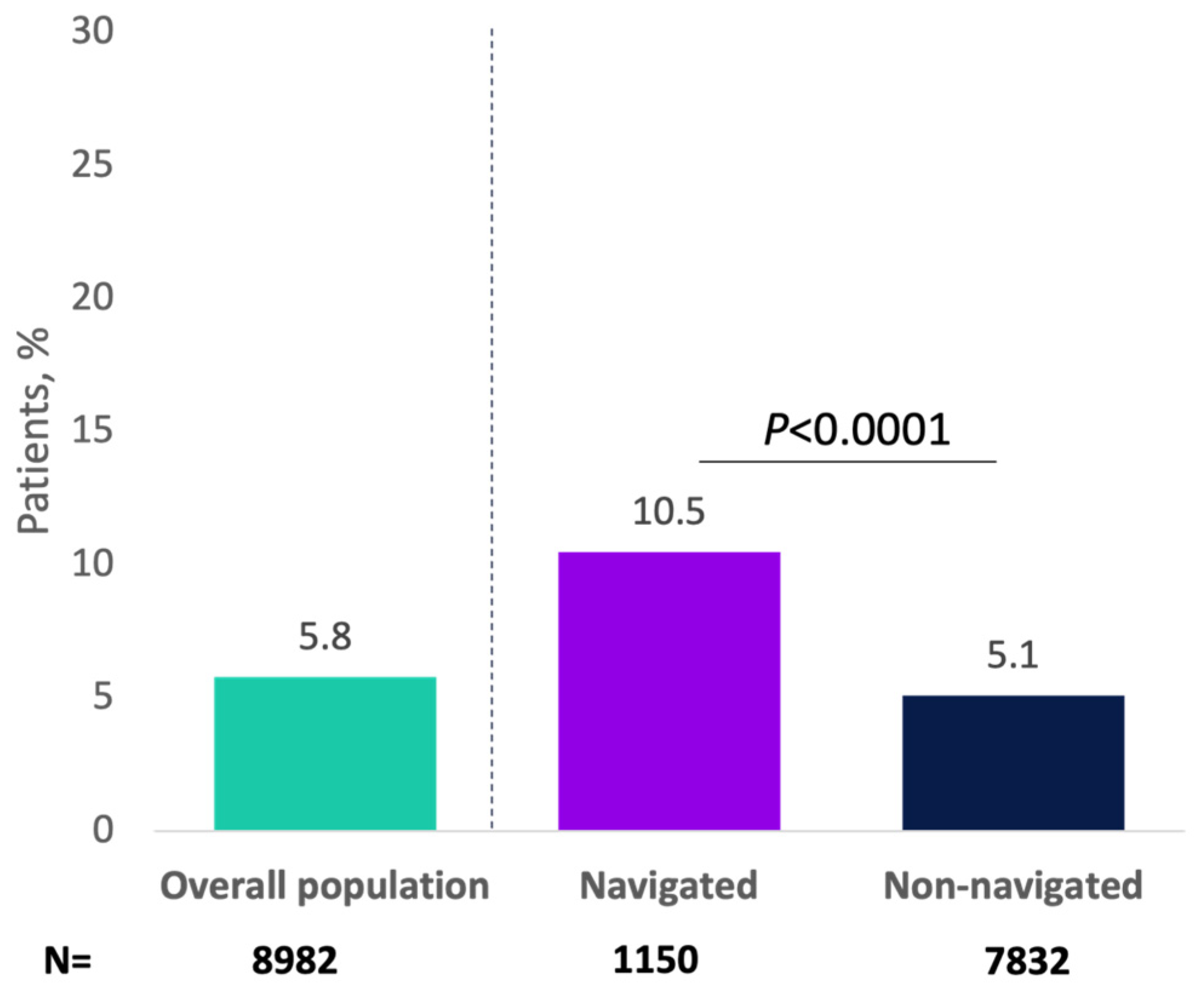 | Overall Population (N = 8982) | Navigated (n = 1150) | Non-Navigated (n = 7832) | |