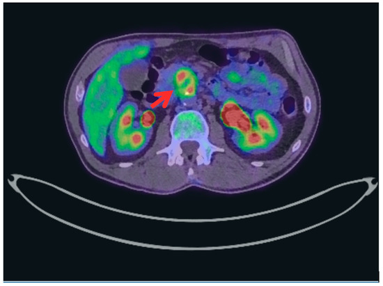 Computed tomography (CT) initially identified a non-specific lesion, which, upon review with fluorodeoxyglucose positron emission tomography (FDG-PET), was found to be a pre-aortic soft tissue mass with peripheral hypermetabolism and central hypometabolism, consistent with an inflammatory or infectious process (Figure 1). Arterial phase CT confirmed a 9 mm saccular false aneurysm from the anterior wall of the infrarenal aorta (Figure 2), with additional foci in the bilateral iliac arteries, consistent with mycotic aneurysms. Urine cultures later confirmed Mycobacterium bovis infection. The patient underwent successful endovascular stenting and anti-mycobacterial therapy, with excellent clinical improvement.