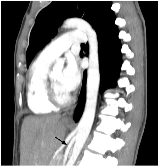 Sagittal computed tomography. The aortomesenteric angle is reduced to 14° (black arrow).