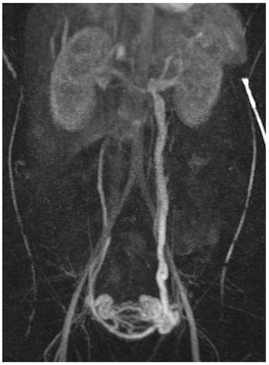 Magnetic resonance imaging, coronal plane. Dilated pelvic veins on the left side.