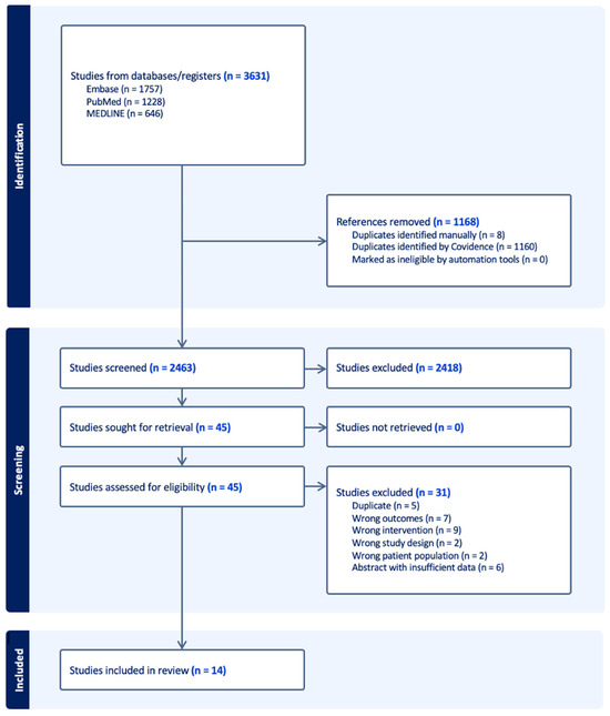 PRISMA flow diagram illustrating the study selection process. A total of 3631 records were identified through database searches (Embase, PubMed, and MEDLINE). After removal of 1168 duplicates (8 manually and 1160 by Covidence), 2463 studies were screened. Of these, 2418 were excluded based on title and abstract review. Forty-five full-text articles were assessed for eligibility, with 30 excluded for reasons including duplicate publication (n = 5), wrong outcomes (n = 7), wrong intervention (n = 9), wrong study design (n = 2), wrong patient population (n = 2), or insufficient data in the abstract (n = 6). Fourteen studies were included in the final review.