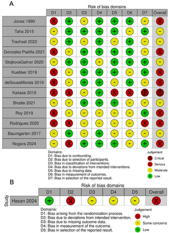 Risk of bias assessment for included studies using the ROBINS-I tool (A) for observational studies and the Cochrane Risk of Bias (RoB) tool (B) for the randomised controlled trial. The ROBINS-I tool evaluates seven domains: confounding, selection of participants, classification of interventions, deviations from intended interventions, missing data, measurement of outcomes, and selection of the reported result. The Cochrane RoB tool assesses five domains specific to randomised studies. Abbreviations: ROBINS-I = Risk Of Bias In Non-randomised Studies of Interventions; RoB = Risk of Bias.