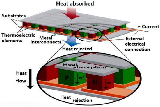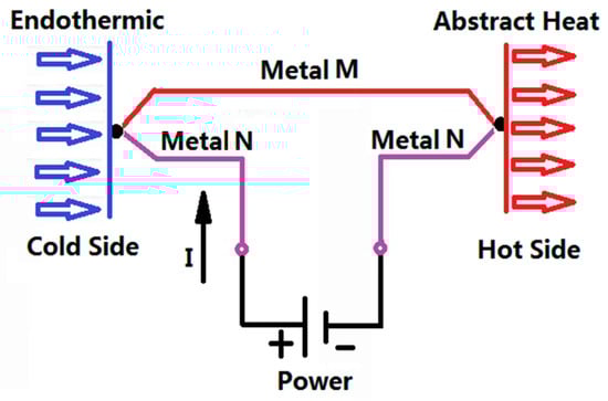 The second thermoelectric effect is known as the Peltier effect []. When there is a current through the circuit composed of different conductors, in addition to producing irreversible Joule heat, the different conductors at the junction with the direction of the current will have different heat absorption, which is an exothermic phenomenon. Assuming that the number of free electrons in the A terminal is large, the number of free electrons at the B end is small, and if the current flows from A to B, the temperature at the B end will increase; conversely, the temperature of the B side will be reduced. The schematic diagram is shown in Figure 1. As early as 1834, Peltier found this phenomenon, but because the technical conditions were not allowed at that time, it was not popularized. Now, with the rapid development of semiconductor technology, thermoelectric chips and thermoelectric coolers were produced []. A semiconductor thermoelectric chip is made up of several hundred pairs of thermocouples, and the temperature control can be realized at both ends of the cold and heat. Manoj et al. [] designed a vehicle refrigeration and air conditioning system using thermoelectric chips as the core cooling measures, and designed the corresponding heat sink device. Through comparison, the effect of this air conditioning system is better than the traditional air conditioning system. Kaushik et al. [] gave the number of thermocouples in the first and second stages of a Thermoelectric Chip (TEC) for maximum cooling power energy, and the exergy efficiency conditions were optimized. Meng et al. [] showed the effects of a thermocouple’s physical size on the performance of a thermoelectric heat pump (TEH) driven by a thermoelectric generator (TEG). The schematic diagram of heat transfer for a thermoelectric chip is shown in Figure 2 [].