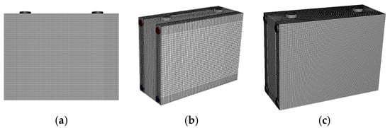 Then, hexa-dormant structured mesh was drowned by ICEMCFD (ANSYS, Inc., Canonsburg, PA, USA) Hexa-dormant structured mesh has better orthogonality, a higher calculation accuracy, and a fast computation speed. Because the complexity of the geometric model will increase the computation resources required and the complicated geometry model may easily create an error in the simulation, in this paper the model was simplified to a heat source that was heated with the rate of 100 W from the inside. The mesh model is shown in Figure 4. The number of cells, faces, and nodes of the single battery is 230,131, 703,861, and 243,824, respectively. The number of cells, faces, and nodes of the water cooling model is 129,021, 399,860, and 141,792, respectively. The number of cells, faces, and nodes of the simplified thermoelectric model is 293,242, 843,808, and 266,435, respectively.