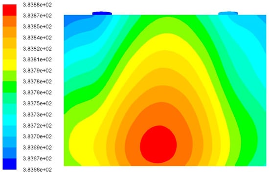 In the introduction of this paper, it is pointed out that many scholars have simplified the battery to be an internal homogeneous heating body. This article also follows this method. Then, a battery model was built with a heating rate of 100 W and an ambient temperature of 298.15 K using ANSYS 17.0. The temperature profiles of the battery under natural convection are shown in Figure 5. The maximum temperature of the battery is 383.8 K, and the battery’s center position is slightly hotter compared to the battery’s edge. This is in line with the mechanism of the heat production of the battery. Then, the above model was regarded as a reference and the following work was based on this model. To keep the simulation comparable, the battery parameters are consistent with the heating power of the battery in the temperature regulation. The temperature regulation is determined and improved by comparing the surface temperature of water cooling with that of thermoelectric cooling, and the optimal temperature profile of the battery was obtained.
