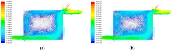 Four different inlet velocities, v = 0.2 m/s, v = 0.5 m/s, v = 1.0 m/s, and v = 2.0 m/s, were adopted in the simulation of structure A, and the corresponding velocity vectors were obtained as shown in Figure 7. The flow velocity distribution is Z-shaped, and the velocity is slow or even close to zero at the center of the channel. This phenomenon decreased with the increase of flow rate, but did not disappear. Similarly, four different inlet velocities, v = 0.2 m/s, v = 0.5 m/s, v = 1.0 m/s, and v = 2.0 m/s, were adopted for structure B, and the corresponding velocity vectors were obtained as shown in Figure 8. The results show that the distribution of the liquid velocity is relatively uniform. However, the velocity of the central position of the flow channel is still relatively slow when the flow rate is 0.2 m/s, and even close to zero at some locations. It was found that increasing the flow velocity of the inlet coolant could alleviate this phenomenon. The vortex phenomenon at the central part of the flow channel is further weakened when the flow velocity increases to 1.0 m/s, and the flow velocity is basically uniform within the whole flow channel. However, the phenomenon reappeared again when the flow velocity further increased. It is concluded that the stagnation of the liquid at the channel center firstly decreased and then increased with the increase of the flow velocity. Therefore, it is maybe the better choice to have a flow velocity of 1.0 m/s.
