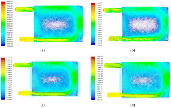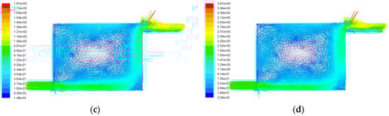 Velocity vectors of structure B. (a) v = 0.2 m/s; (b) v = 0.5 m/s; (c) v = 1.0 m/s; (d) v = 2.0 m/s.