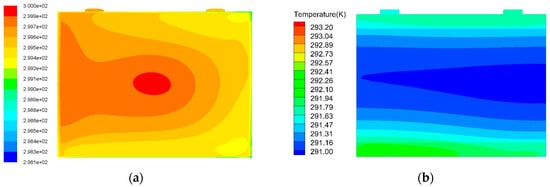 Based on the previous mesh grid model, the cooling effects of the modified cooling structure were analyzed. At the same time, they were compared with the effect of liquid cooling. The inlet flow velocity of the heat exchanger is 1.0 m/s, and the inlet temperature of the liquid coolant is 298.15 K. The corresponding surface temperature distributions are shown in Figure 9.