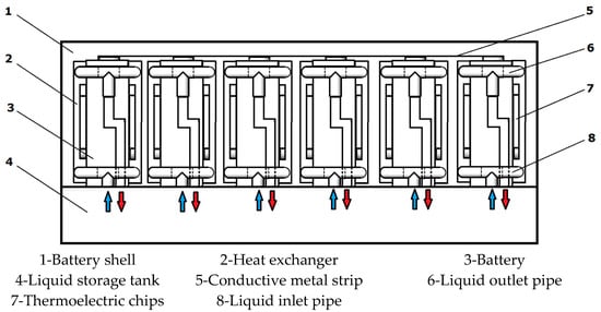 According to the best structure determined above, we designed the pack model of the battery group. The corresponding thermostat structure and thermoelectric chip are added at the same time, the schematic of which is shown in Figure 10. The bottom of the heat exchanger is connected with the liquid inlet of the temperature regulating pipeline, and the top is connected with the liquid outlet of the temperature regulating pipeline. The heat exchanger has a thermoelectric card slot that can be plugged into six thermoelectric chips, which is equivalent to twelve thermoelectric chips for each battery. The symmetrical structure design can ensure full contact between the battery and the temperature control module, which is helpful to improve the temperature control efficiency.